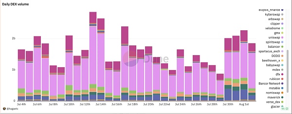 据 Dune 数据显示,在 Curve 之后,各个 DEX 交易量甚至在小幅回升,以太坊的交易量仍占 66.5 % 的主流份额,日交易额稳定在 10 亿美元左右。