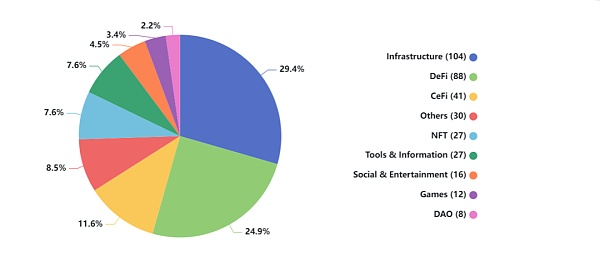HashKey对于基础设施可谓是“情有独钟”,在所有投资项目中占超过三分之一,为34%。第二、第三名分别是DeFi(17.6%)、CeFi(9.4%)。