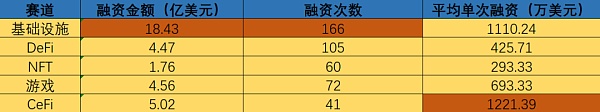 从赛道分类上来看,目前最受机构投资者欢迎的还是基础设施,无论是融资金额还是次数,都排在所有赛道的第一名。但从平均单次融资金额来比较,CeFi的单次平均融资额最多。看来CeFi的融资次数虽然少,但每一次都能融到一笔不菲的金额。