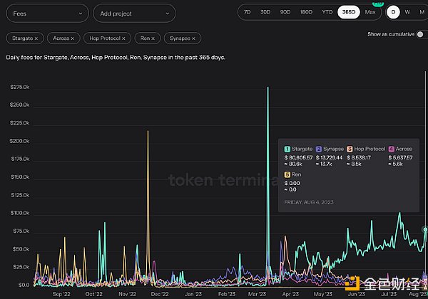 最近一年 Stargate 产生的费用是在不断增长的,最近半年费用(fee)上涨的幅度达到了 400% 以上,可以说增速还是比较快的。