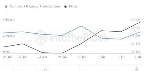 IntoTheBlock数据显示,ETH鲸鱼的交易数量在几天内增加了一倍。这一增长使他们的总交易量在两天内从2,120笔增加到3,230笔。交易数量的激增意味着从7月2日到7月4日的短短48小时内增长了54%以上。在7天的时间里,ETH鲸鱼转移了近200亿美元。
