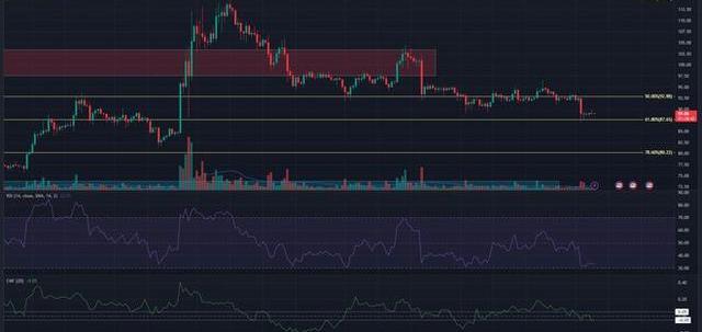 CMF为-0.05,即将显示大量资金流出市场。RSI为33.3,显示出强劲的看跌势头。