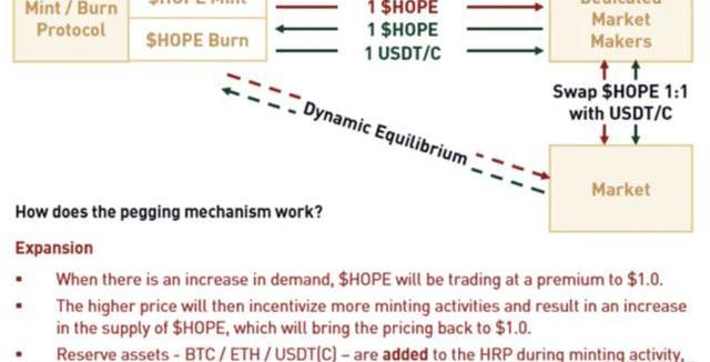 第二、三阶段:(HOPE的资金储备池将增添更多稳定币,直到储备池的资金达到)HOPE市值的数倍,后续随着BTC和ETH价格的升值,HOPE价格则会随着加密资产市值的扩大而上涨,最终涨至1美元。
