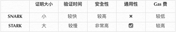 ZKP 目前分为 SNARK(Scalable Transparent Argument of Knowledge)和 STARK(Succinct Non-interactive Argument of Knowledge)两个系统,都可用来创建有效性证明,主要区别我们用以下表格来说明: