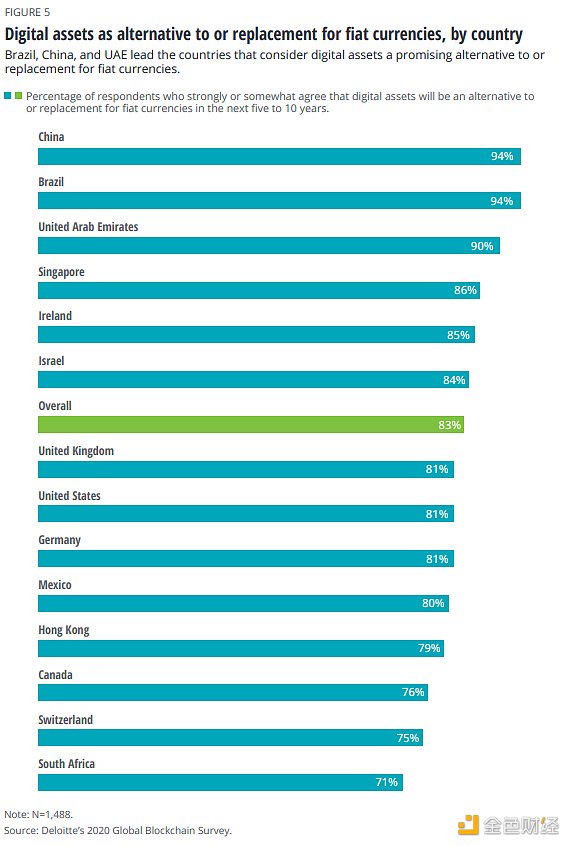 德勤在报告中将数字资产定义为“以数字形式表示的具有内在价值或获得价值的东西”。据其调查,中国、巴西和阿联酋在那些认为数字资产是法定货币的替代或替代法定货币的国家中处于领先地位。图表中按照国家划分,统计了那些认为数字资产将在未来五到十年内替代法定货币或替代法定货币的受访者的数据。