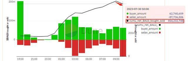 下图中绿色柱状代表BALD的买入量,红色柱状代表BALD的卖出量,黑色折线代表BALD的净买入量,从图中可以看出,BALD上线之后买盘整体非常活跃,但伴随价格上升,卖盘开始高于买盘,显示出一定见顶迹象。