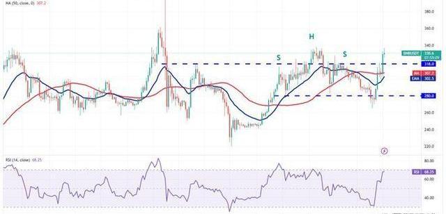 买家正试图通过将价格推高至338美元以上来进一步巩固他们的地位。如果他们这样做,则负H&S模式将失效。BNB/USDT货币对可能首先反弹至360美元,然后反弹至400美元。