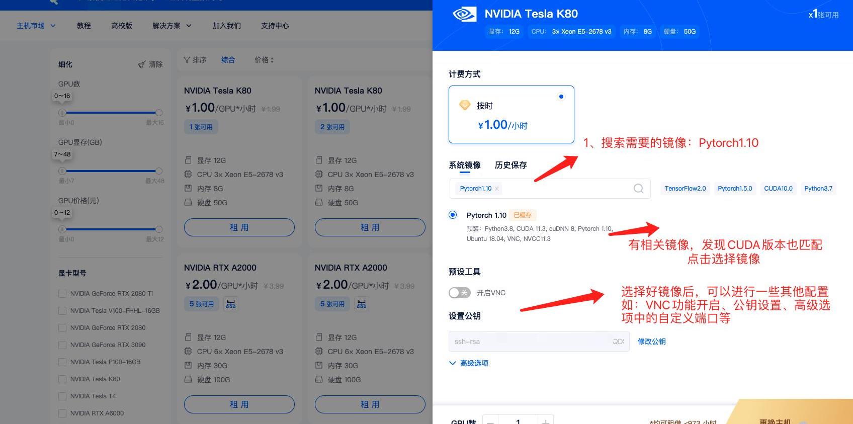 1选择基础镜像,我们直接搜索Pytorch1.102发现有相关镜像,并且其他依赖如CUDA11.3也符合要求,点击选择即可3选择好镜像后,我们可以进行其他配置,如:VNC功能开启、公钥设置、高级选项中的自定义端口等