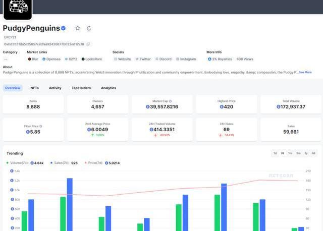 PudgyPenguins是本周最热门的NFT系列,在前不久刚刚完成900万美元融资的NFT项目PudgyPenguins5月19日发推文宣布,将NFT和区块链技术与实体玩具相结合的玩具产品PudgyToys、以及NFT数字平台PudgyWorlds已正式发布。地板价目前在5.85e,作为老牌NFT项目热度依旧不减。