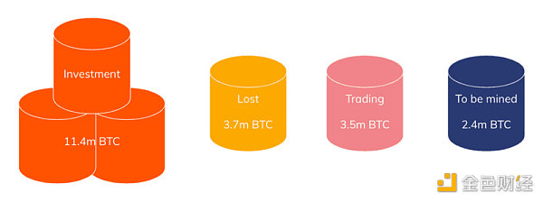 报告还将另外 20% 的比特币归为“丢失的比特币”,这些比特币在地址中保留了五年甚至更久但都没有发生转移,大概有 370 万枚。Chainalysis 表示,通过估计,“剩下的 350 万枚比特币——占比特币总量的 19%——移动频繁,主要是在交易所之间转移,我们称之为用于交易的比特币。”