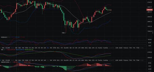 昨日早间最低跌倒1938附近之后行情便开始回暖今天早间都要去突破2100一线附近了,但依旧未能冲破上方压力线持续呈现震荡BOLL上方的走势,日线价格回到5日均线上方,下方支撑看到30均线2040位置.小时线附图指标BOLL通道张口向上运行,逐步企稳2070附近,MACD红色动能柱逐步向上运行,KDJ依然向上拐头运行。北斗星认为整体还是比较稳定的所以采用低多的方式。2060附近多,目标2095附近,破位看2130附近,止损2020附近.