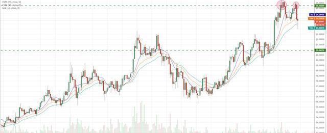 跌破10日均线将是动力减弱的第一个迹象,跌破20.9633美元将暗示趋势可能发生变化。