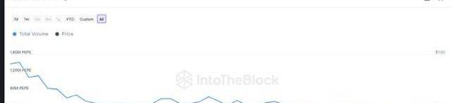与此同时,转账量也缩水到几乎为零。如下图,4月中旬链上转账量一度闪现~1550万亿PEPE。现在曲线几乎变平了。截至发稿时,它仅反映了50万亿PEPE的价值。