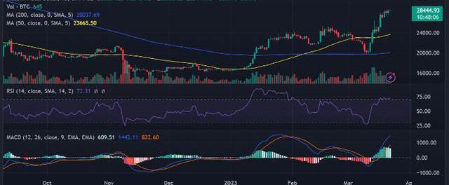 相对强度指数表明比特币在发稿时处于强劲的牛市趋势。从日周期图的价格走势来看,其RSI线已经升破70,进入超买区域。截至撰写本文时,它的收益不到1%,交易价格超过28,000美元。