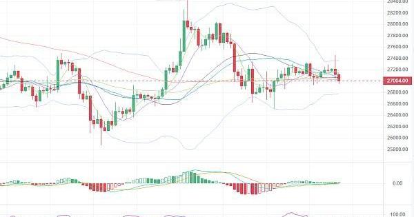 技术结构来看,日线级别中,运行通道形成持平状态运行,价格在中轨一线争夺,多头量能缩量,蓄力得不到维持,均线走势上略微偏弱,趋势上弱势修复延续,力度并没有表现出很明显的效果。四小时级别线中,价格企稳在中轨上冲高未能企稳,运行通道形成缩口向下状态,量能得不到连大幅度的释放,伴随着虽是转空的迹象,均线已经拐头明显,小周期震荡偏弱,下探有一定的延续需求,技术点位上方继续关注能否突破27500一线阻力,此位依然还是目前的强压力,一旦行情再冲破站稳此位之上,那么短线多头很有可能会借机拉升。反之若是结构不改,保持高空做空。那么前日给出的27300-27500高空思路可继续参考空单持有。从小时图看,布林带运行通道开口下行,k线由上轨下行至下轨下方。价格上还处于一个持续缓慢的走低,空头情绪强烈,下方关注26600/25800支撑,临近点位可小仓开多进场。