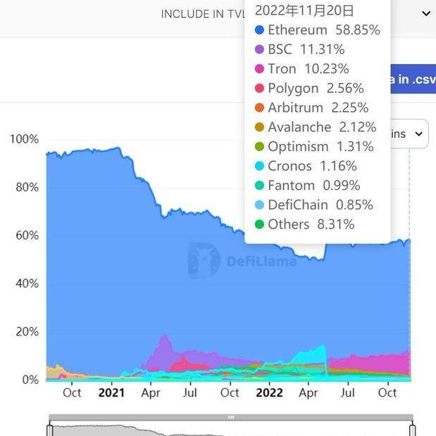 TVL目前在10亿美金以上除了ETH,还有BSC、Tron、Polygon,arb。从近期图表的趋势上可以看到,Arb,op两条L2tvl份额有明显的上升趋势,分别排到了第5和第7。近期因为ftx事件,比特币从2w跌到1w6,所有链的tvl都有明显的下降,其中avax,cro的下降趋势相比其他链,受影响更大,本月tvl下降了40%+。