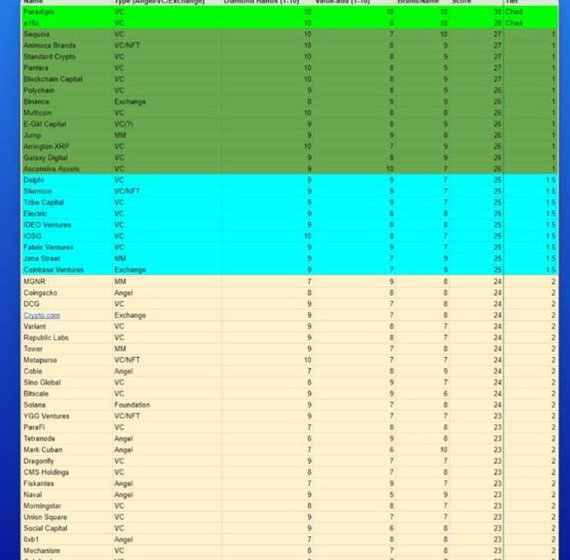 目前,一流的加密货币VC包括Paradigm、a16z、Sequoia和BinanceLabs。下面,您可以找到一个包含所有VC排名的表格: