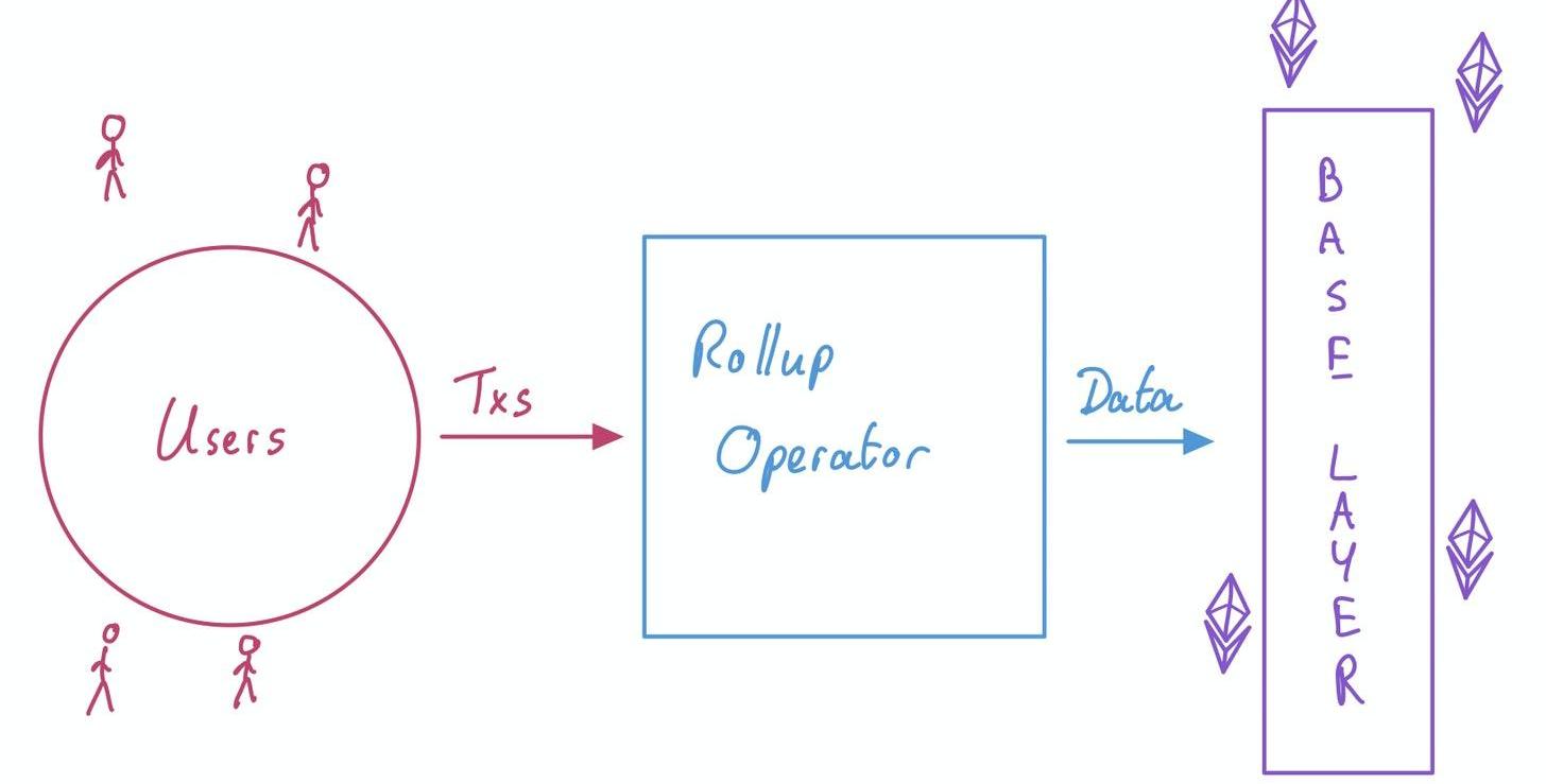 我们的扩容故事当中的三个角色:用户在L2上进行交易,rollup运营商在用户和基础层之间作为一个接口,而最终的数据发布到基础层