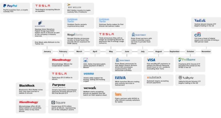 ●机构采用:金融机构和企业在加密行业中变得更加活跃。2021年,一些银行显著增强了加密货币托管服务的能力。尽管比特币现货ETF在美国继续遭到拒绝,但投资者现在可以更多地获得结构性产品,如比特币期货ETF。此外,在?2021年中,公司接受比特币和其他加密货币作为支付渠道并在资产负债表上持有比特币的情况变得更加普遍。