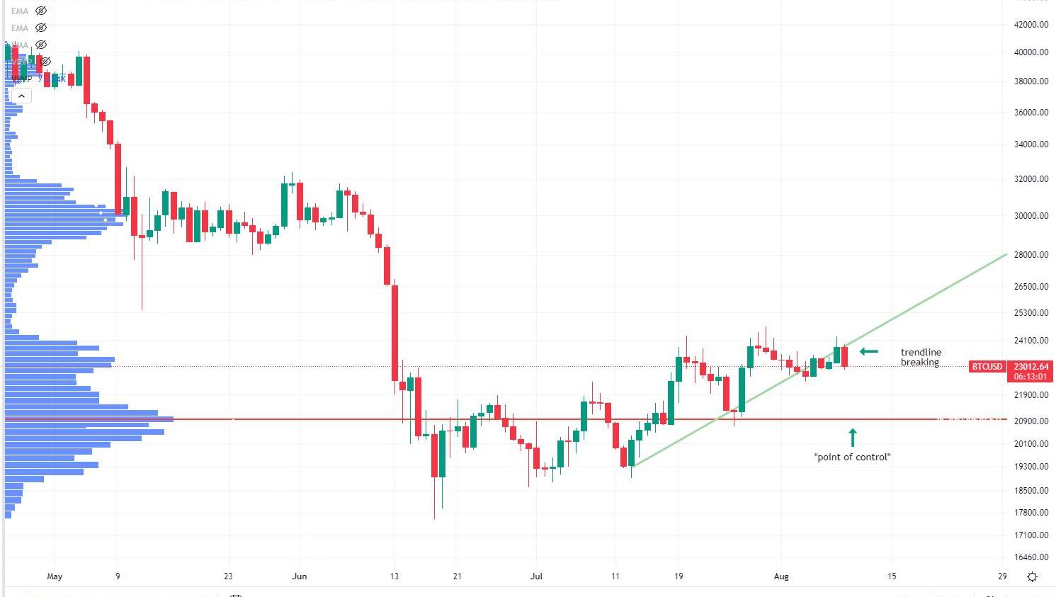 如果比特币未能重拾这一趋势,它似乎可以在一个区间内进行交易,而不是大幅下跌。交易量分布可见范围工具显示了23,000美元和20,000美元水平的活动峰值。
