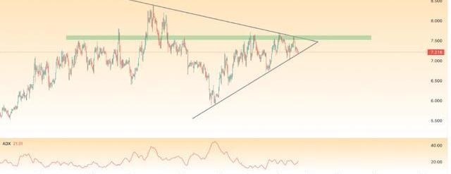 山寨币价格非常接近对称盘整的顶点,这通常被认为是决定性的。与此同时,ADX正在缓慢上升,显示出反弹的力度,表明价格可能很快就会出现看涨突破。因此,可以预期会出现明显的反弹,最初可能会触发反弹超过8.20美元,但也预示着跌至7美元的可能性。