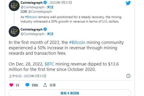 比特币(BTC)开始显示出适度牛市的迹象,表明其努力正在取得成果。在2023年的第一个月,挖矿奖励和交易费用使挖矿社区的收入增加了近50%。这被认为是可以帮助BTC限制其损失的最重要因素之一。