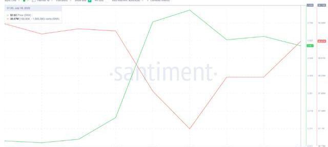 与此同时,Arbitrum网络似乎并未受到最近动摇生态系统的DeFi攻击的影响。Santiment的链上数据显示,加密货币鲸鱼再次开始购买ARB。如下图所示,7月13日至7月19日期间,持有100万至1000万枚代币的鲸鱼增加了3100万个ARB代币。按目前1.25美元的价格计算,新投资价值约为3880万美元。