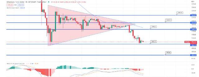 以太坊正试图收回4小时图上的1,100美元水平。ETH/USD已突破对称三角形的下侧,表明可能延续强劲的下跌趋势。