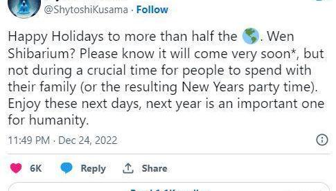现在,根据该项目的一位首席程序员在Twitter上的说法,Shibariumlayer-2区块链即将推出。这可能会将SHIB价格推高至1美元。开发者草间正敏在12月24日发推称,由于假期的原因,在年底之前几乎不可能展示Shibarium。草间告诉Shiba的人们,Shibarium将“很快”到来。