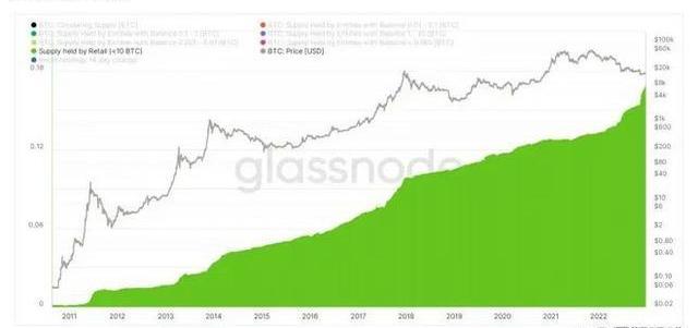 整个熊市发生了很多变化。随着比特币以折扣价出售,散户投资者纷纷购买。如上图所示,持有BTC供应量的散户投资者处于历史最高水平。虽然一些人认为这是一个积极的迹象,但其他一些人表示担忧。