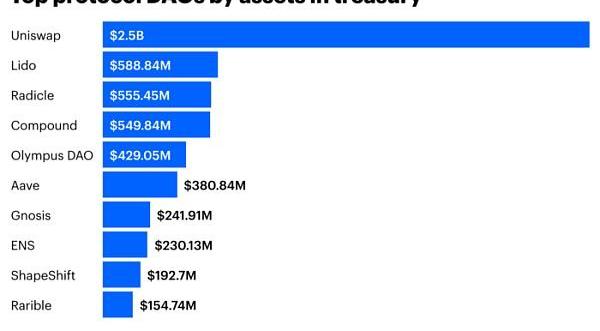 截至12月20日,资产管理规模最大的协议DAO是Uniswap、Lido、Radicle、Compound、Olympus和Aave。