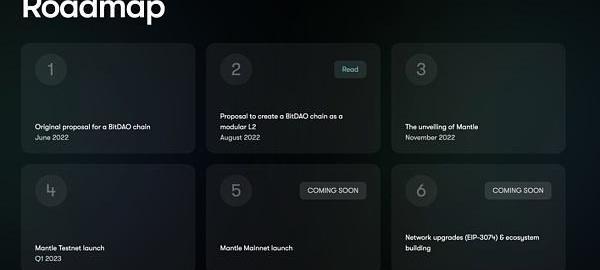 据官方公布的路线图显示,Mantle将于2023年Q1推出测试网(EigenDA+OPU),测试网平稳运行3个月后上线基于OPU的主网(EigenDA+OPU),主网运行6-12个月后上线基于zk-Rollup的主网(EigenDA+zkRU)。