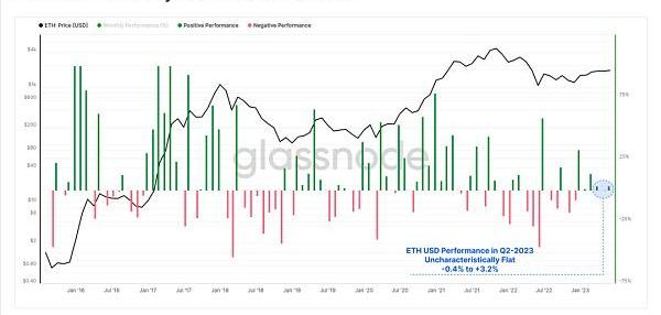 最近几周,数字资产市场受到了BTCETF申请的影响,BTC的表现明显优于其他资产。虽然贝莱德申请BTCETF的举措让ETH价格提升了11.2%,但第二季度收盘时,它仅比4月的开盘价高出6.4%,价格出乎意料的稳定。
