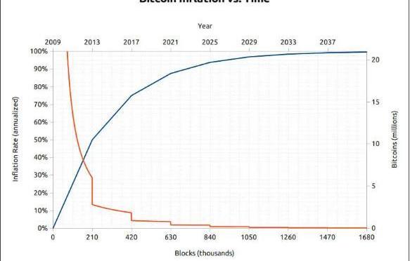 根据发行图表和硬编码区块链,2140年是比特币生产枯竭的目标日期。每四年,每个区块产出的比特币数量就会减半。