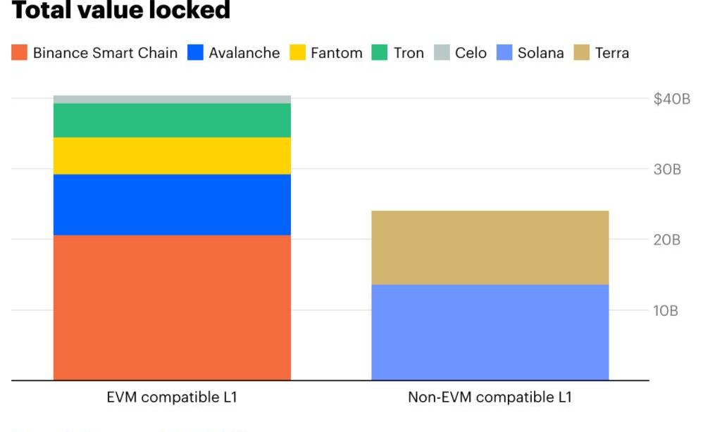 在过去的10个月里,新的第1层成群结队地上线,这些网络的总价值在同一时期从0美元飙升至75B美元左右。该领域目前由Solana、Avalanche、Terra和BinanceSmartChain主导,每个链都拥有不断增长的生态系统,价值已超过100亿美元。