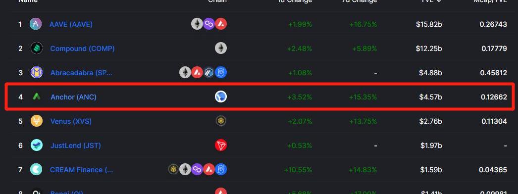 Anchor是一款去中心化储蓄协议,目标是为UST储蓄用户提供20%左右的收益率,Anchor白皮书描绘的愿景是:尽管出现了很多金融产品,但在DeFi领域,还没有一款足够简单、安全而且能获得大众认可的储蓄产品。最终,我们希望Anchor成为区块链领域获得被动收入的黄金标准。20%的收益率在加密领域看似一般,但是在借贷赛道中横向对比以下,20%已经具有足够的竞争力了,通过数据我们可以看到,Anchor的储蓄利率几乎稳定在19%左右,这也是Anchor最核心的增长手段,这样稳定的利率足够吸引大玩家。目前Anchor的总锁仓为45亿美金,位于整个DeFi协议榜单的第15名。