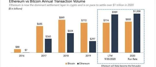 就网络发生的交易经济价值而言,在2021年,以太坊甚至会一直超过比特币。