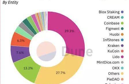 DuneAnalytics统计数据显示,截至12月12日,Lido拥有所有以太坊质押的29.3%的份额,其次是Coinbase占13.2%,Kraken则以7.6%排名第三。