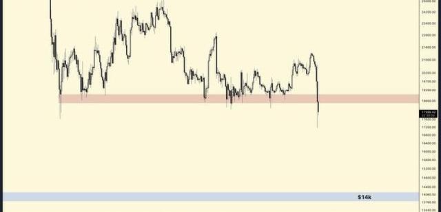 “投降事件后局部底部的潜在目标:比特币13,000美元至14,000美元。”