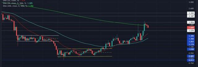 当前从200EMA的逆转可能会在1.4-1.5美元区间找到反弹的基础。从这个范围内可能掉头将使代币定位为持续上涨。在这种情况下,买家必须在未来几天寻找对1.9-2.1美元区间的潜在重新测试。