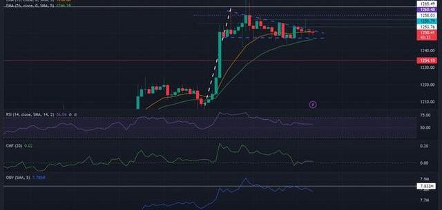特别是,平衡量(OBV)下降,这意味着购买压力有限。RSI也从超买区域逐渐回落并接近中点,表明买盘压力有所缓解。