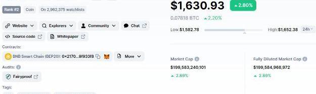 以太坊目前的价格为1,630美元,24小时交易量为190亿美元。在过去的7天里,以太坊的涨幅超过了24%。CoinMarketCap现在排名第二,实时市值为1990亿美元,高于昨天的1940亿美元。