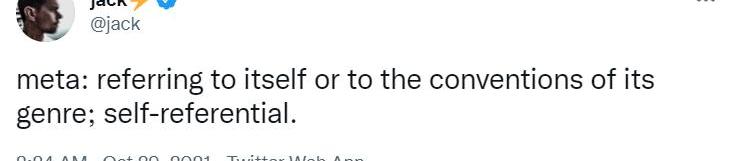 10月29日,与Facebook互为竞争对手的社交巨头—推特的创始人JackDorsey发推道:“meta:指的是自己或其流派的惯例;自我参照。”暗讽了Facebook的局限性。而早在2019年12月11日,JackDorsey就宣布启动了一项名为BlueSky的新计划,该计划旨在为社交媒体创建一个去中心化的标准,而推特也囊括其中。虽然JackDorsey没有直接透露BlueSky团队的具体工作,但他暗示利用区块链技术“基本原理”可以提供一些工具来实现社交媒体“开放和持久地托管、治理、甚至货币化”。