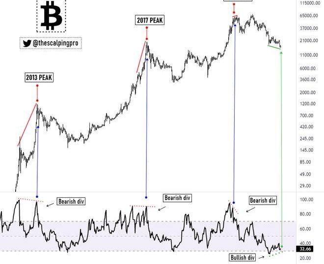 “每个牛市峰值$BTC都在RSI上形成看跌背离,随后出现熊市修正!”他解释说: