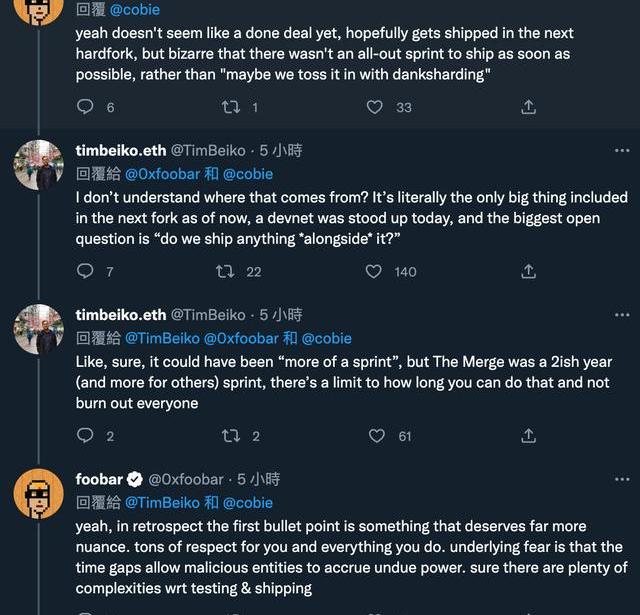 值得注意的是,原本以太坊社群在上次会议表示,将优先讨论上海升级的「优先提款顺序」,但以太坊基金会核心成员、OPLabsCEOLiamHorne今日却投下震撼弹,计划讨论将EIP-4844纳入考虑范围,引起不少急于提款的社群成员不满,对此知名KOLCobie就表示:
