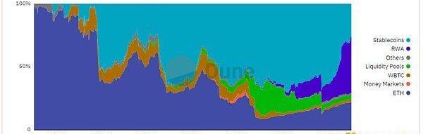 在经历此类事件之后,MakerDAO也不断尝试将抵押物多元化,MakerDAO系统目标是逐步建立去中心化的稳定货币,而构建货币系统,需要以当前具备共识的资产作为抵押物,借用其信用。原生加密货币自然是抵押物的重要组成部分,但本质上加密原生资产具有高度相关性,仅仅通过加密资产很难实现抵押物的多元化。为分散当前加密货币市场的风险,MakerDAO引入了部分RWA资产作为稳定币Dai的抵押物。