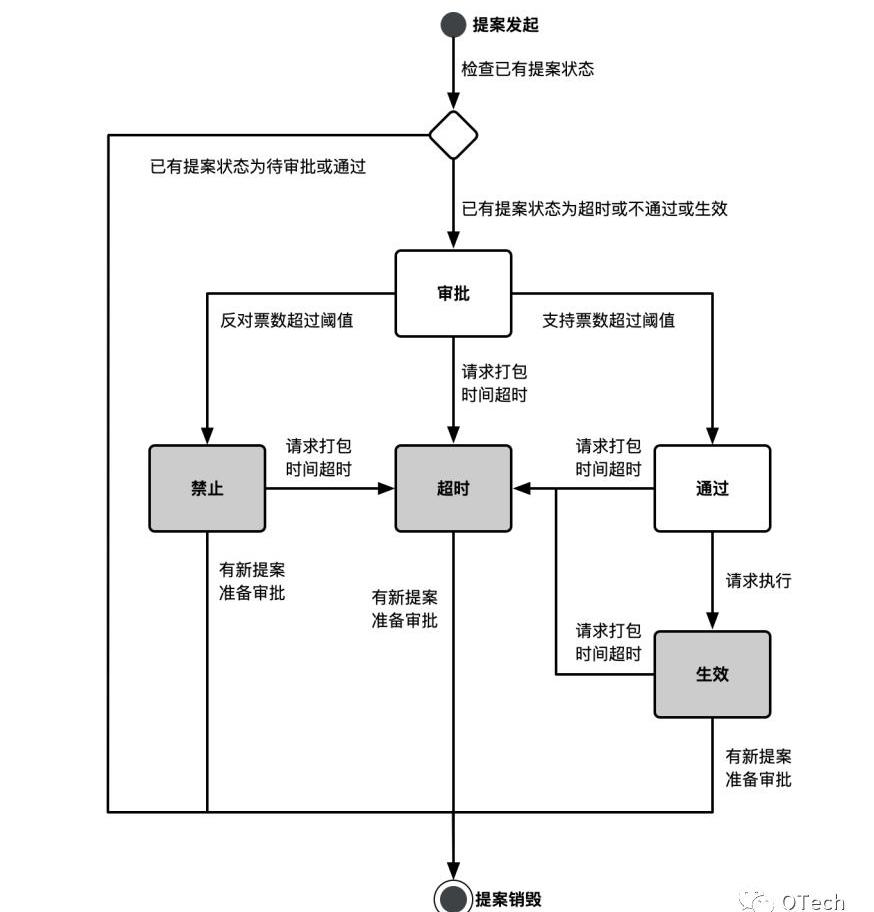 对于单个提案,有提案发起、提案审批、提案超时、提案禁止、提案通过、提案生效、提案销毁这几种状态。其状态的流转如下图所示: