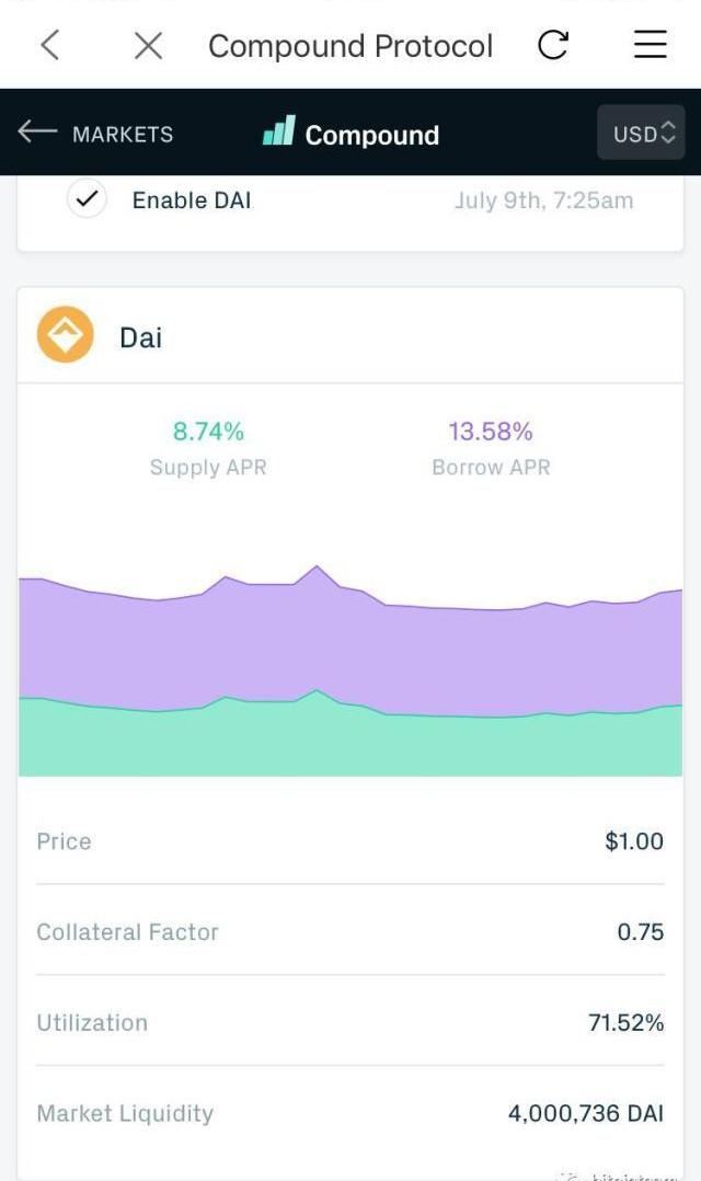Compound的存币利息与借贷利率及借贷比例具有相关性,当借贷者愿意为借贷支付更高的利息,有更多的人借贷时,相应的存币利息也会越多。如下图所示,当前的借贷利率为13.58%,DAI的流通量为4,000,736,出借率为71.52%,此时的利息率为8.74%。