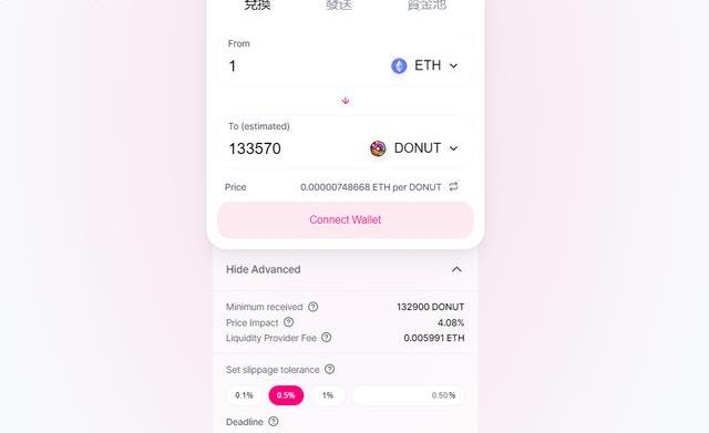基本上你连接钱包之后,就可以拿ETH去换你想要的代币,没有K线,也没有挂单,系统自动帮你成交。在下面的高级选项里面,还会根据你要兑换的数量,告诉你这笔交易对这个代币的价格的影响有多大,你还可以设置自己能够容忍的最大滑点是多少,这样相当于在容忍范围内挂了个单,并在Deadline时间内有效。