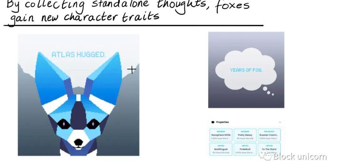 虽然不可替代,但哲学狐狸能够进行一种改变——通过加法改变。随着时间的推移,狐狸可以增强自己,赋予他们更多的背景故事和更大的复杂性。他们通过收集独立的想法来做到这一点。除了100只狐狸,我们还发布了10条无主的想法。